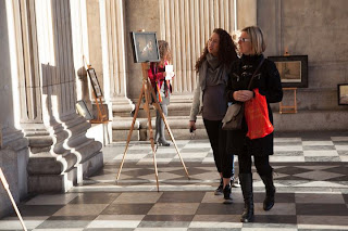 When the Cathedral closed its doors, easels have been placed in chosen spots and black and white pictures, or sepia treated ones have been displayed. Some of them look like paintings and they all depict St. Paul's and the people who happened to be there looking for shelter under the portico and while resting with the back at its columns.